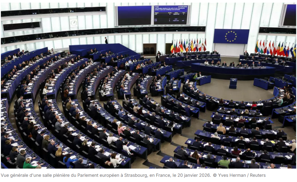 L'Union européenne riposte à la dernière menace douanière de Donald Trump. Les principaux groupes politiques du Parlement européen ont confirmé mardi 20 janvier la suspension du processus de ratification de l'accord commercial entre l'Union européenne et les États-Unis. Selon la présidente du groupe social-démocrate, les députés européens disposent d'un « accord majoritaire » des groupes politiques pour geler cet accord.